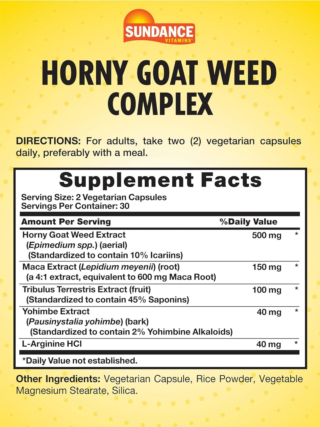 Each serving delivers 500 mg of Horny Goat Weed extract with 150 mg of Maca extract, 100 mg of Tribulus Terrestris Extract, 40 mg of Yohimbe Extract, and L-Arginine HCI. Horny Goat Weed contains an abundance of naturally occurring compounds, making it a desired supplement – especially for men.